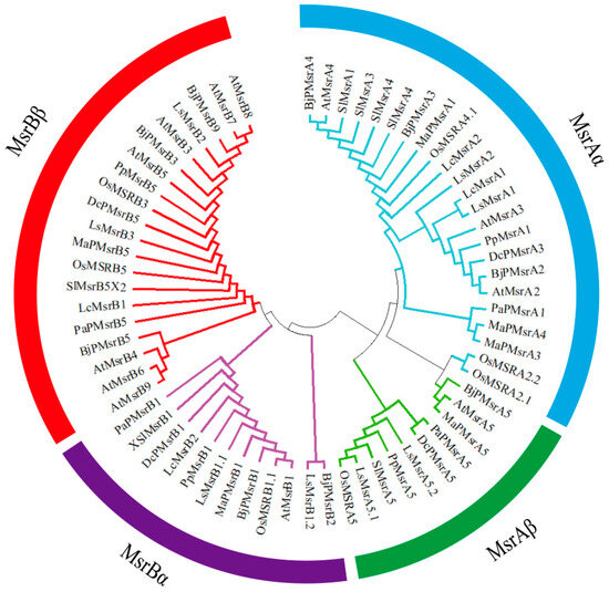 Msr belongs to the oxidoreductase protein family, which is categorized into three subfamilies based on substrate specificity and phylogenetic clustering: MsrA, MsrB, and fMsr [19]. MsrA and MsrB are found in both prokaryotes and eukaryotes, whereas fMsr is restricted to prokaryotes and a limited number of single-celled eukaryotes. Among them, MsrA was the first methionine sulfoxide reductase to be discovered [20]. Early research on Msr focused primarily on animals and Escherichia coli. However, as research progressed, it was discovered that plants possess significantly more Msr variants than mammals [13,21]. For instance, mice have only four Msr genes [22], while Arabidopsis thaliana contains fourteen Msr genes [23], which has drawn considerable interest from researchers. Over the past decade, Msr has been identified and studied in various plants, including bananas [24], tobacco [25], peppers [26], tomatoes [27], soybeans [28], papayas [29], wheat [30], corn [31], and strawberries [32].