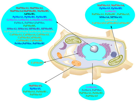 In plants, Msr is distributed across various organelles [42]. MsrA is localized in the nucleus, mitochondria, chloroplast, cytoplasm, and endoplasmic reticulum, while MsrB is found in the nucleus, cytoplasm, chloroplast, and endoplasmic reticulum. Additionally, the subcellular localization of MsrA and MsrB is predominantly concentrated in the nucleus and chloroplasts (Figure 4) [33]. This diverse distribution of Msr proteins in plants enables them to play a crucial role in plant growth, development, and stress resistance [9,34].