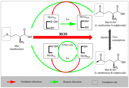 Met is a sulfur-containing amino acid, and its sulfur atoms are highly prone to oxidation, making it one of the most oxidized amino acids in proteins [15]. Oxidation of the chiral sulfur atoms in Met produces two diastereomers, Met-S-SO and Met-R-SO, which typically exist in equal amounts (Figure 7) [31]. MetSO can further undergo oxidation to form MetO2 [80]. Oxidation of methionine in proteins alters their structure and function. In organisms, MetSO can be reduced back to Met by Msr, thereby restoring the function of the oxidized protein [80]. MsrA specifically catalyzes the reduction of Met-S-SO to Met, while MsrB catalyzes the reduction of Met-R-SO to Met [80]. Additionally, in 2007, researchers identified a new enzyme in Escherichia coli, termed fRMsr, which efficiently catalyzes the reduction of free Met-R-SO [81,82]. However, fMsr is primarily found in prokaryotes and certain lower eukaryotes and has not yet been identified in plants, resulting in a lack of research on its presence and function in plant systems [82,83].