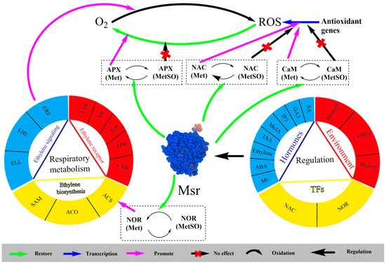 Msrs can be interregulated through transcription factors associated with maturation and participate in response to various stresses. For example, in tomatoes, studies have shown that SlMsrA effectively repairs the oxidative damage of the transcription factor NOR [95]. This repair reverses the reduction in the transcriptional activity of genes related to respiratory metabolism, which is caused by NOR sulfoxide, thereby inhibiting the production of ROS [93].