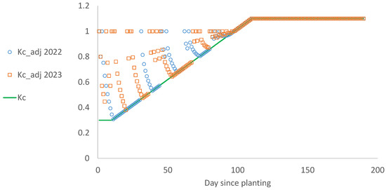 - After a wetting event, actual evapotranspiration will be dominated by evaporation and is calculated through a Ke factor (Equation (A4)). This Ke factor is related to the time after a wetting event in a curved empirical relationship (Equation (A5) and Figure A3). The first four days after the wetting event, Ke is close to 1, representing the stage I, whereby vaporization is controlled by capillary flow to the vaporization plane at the surface. After four days Ke decreases, representing stage II of vaporization where vapor diffusion is controlled [68].