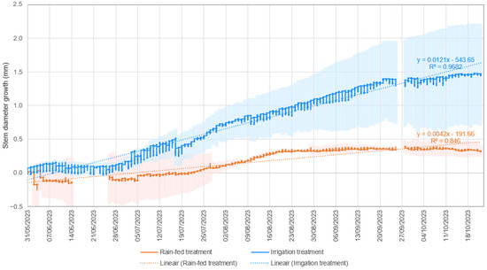 - Nortes, P.A.; Pérez-Pastor, A.; Egea, G.; Conejero, W.; Domingo, R. Comparison of Changes in Stem Diameter and Water Potential Values for Detecting Water Stress in Young Almond Trees. Agric. Water Manag. 2005, 77, 296–307. [Google Scholar] [CrossRef]