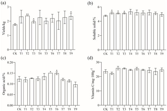 Effects of different amendments on tomato (a) yield, (b) soluble solids, (c) organic acids, and (d) vitamin C; * shows a significant difference compared with CK treatment (p < 0.05); ** shows a very significant difference (p < 0.01).