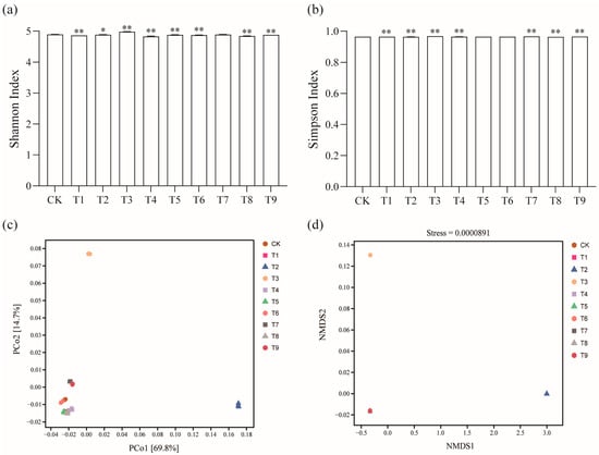 Effects of different amendments on tomato rhizosphere soil diversity: (a,b) α diversity analysis; (c) PCoA analysis; (d) NMDS analysis. * shows a significant difference compared with CK treatment (p < 0.05); ** shows a very significant difference (p < 0.01).