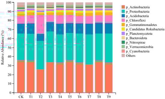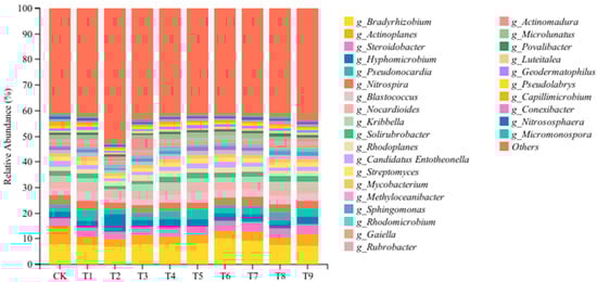 In order to clarify the effects of different amendments on the microbial community of tomato continuous cropping soil, the species with a relative abundance less than 1% in 30 samples were combined at the level of phylum and genus, and the relative abundance of the community was obtained by averaging the three repeated samples in the group. As shown in Figure 3, the composition of the dominant gates under different treatments is the same, but the proportion of each gate is affected by different treatments. At the phylum level, 11 bacterial communities with relative abundance >1% were detected, and 4 dominant communities with relative abundance >5% were detected: Actinobacteria (25.62–35.72%), Proteobacteria (29.95–34.28%), Acidobacteria (7.88–12.35%), and Chloroflexi (7.67–20.95%) (p < 0.05). Compared with the CK, the relative abundance of Proteobacteria increased significantly in the nine amendment treatments, and the maximum increase was 14% in the T3 treatment. The relative abundance of Actinobacteria decreased significantly, among which the T2 treatment decreased the most by 27.26%. The relative abundance of Chloroflexi increased significantly in the T1, T2, T4, T5, and T7 treatments and decreased significantly in the T3, T6, and T8 treatments. Compared with the other treatments, the relative abundance of Acidobacteria, Gemmatimonadetes, Candidatus Rokubacteria, Planctomycetota, and Verrucomicrobia in the T2 and T3 treatments decreased significantly, and the relative abundance of Bacteroidota increased significantly. The relative abundance of Nitrospirae was significantly lower than that of the CK in the T2, T3, T4, T5, T6, T8, and T9 treatments. The relative abundance of Cyanobacteria in the T3 treatment was significantly higher than that in other treatments (p < 0.05).