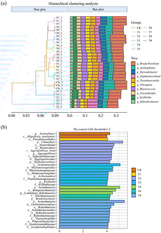 The LEfSe method was used to further analyze the differentiated taxa in the microbial communities of the different treatments, and the results are shown in Figure 5b. Compared with other treatments, in the CK treatment, the communities with significant differences were Actinoplanes and Oligoflexus_tunisiensis; pseudonocardiales had significant differences in the T1 treatment. There were significant differences in the Chloroflexi, Anaerolineae, Bacteroidota, Aggregatilinea_lenta, Aggregatilinea, Hyphomicrobium, and Aocregaulineaceae communities under the T2 treatment. There were significant differences in the Actinomycetia, Micromonosporales, Micromonosporaceae, Streptosporangiales, Actinomadura, Thermomonosporaceae, Kribbella, and Kribbellaceae communities under the T3 treatment. There were significant differences in Acidobacteria, Betaproteobacteria, and Candidatus_Rokubacteria in the T4 treatment and the Nitrobacteraceae and Bradyrhizobium communities in the T6 treatment. The communities with significant differences in the T8 treatment were Actinobacteria, Gemmatimonadetes, Rubrobacteria, Solirubrobacterales, Rubrobacterales, Rubrobacteraceae, Thermoleophilia, Propionibacteriales, Geodermatophilaceae, and Geodermatophilales.