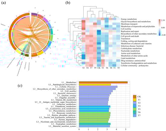 Analysis of KEGG metabolic pathway level under different treatments: (a) relative abundance distribution of soil microbial community functional composition at KEGG 1 level; (b) differences in the functional pathways of soil microbial communities at KEGG 2 level under different treatments; (c) significantly enriched functional pathways within each treatment.