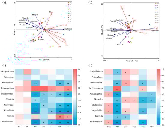 Correlation analysis of soil dominant bacteria with environmental factors and soil enzyme activities: (a) redundancy analysis of the correlation between microbial community and environmental factors at the genus level; (b) redundancy analysis of the correlation between microbial community and soil enzyme activity; (c) heat map of the correlation between microbial community and environmental factors at the genus level; (d) heat map of the correlation between microbial community at genus level and soil enzyme activity. The positive correlation is expressed in red, and the negative correlation is expressed in blue. The significant correlation was expressed as an asterisk (* p < 0.05; ** p < 0.01).