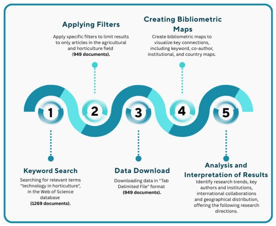Bibliometric analysis was used to identify the main research directions and connections between relevant concepts in horticultural technology. This quantitative method allows us to assess the impact of scientific literature, highlighting the most influential papers, authors, and institutions, as well as the relationships between them [58,59].