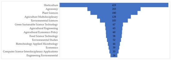 To narrow the analysis to relevant scientific fields, a filter was applied based on the related Web of Science categories. The major fields included in the analysis were agricultural sciences (horticulture, agronomy, plant sciences, agricultural engineering), environmental sciences, biotechnology, agricultural economics, applied engineering, and other related fields. The most representative categories (Figure 2), according to the number of papers identified, are Horticulture (419), Agronomy (203), Plant Sciences (180), Multidisciplinary Agriculture (128), and Environmental Sciences (105). After applying this filter, the dataset was reduced to 949 papers, which were used for bibliometric analysis.