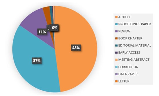 Subsequently, the documents were categorized (Figure 3) according to publication type, the majority being scientific articles (478), followed by conference proceedings (365) and literature reviews (109). Other document types identified include book chapters (27), editorial materials (9), early access articles (4), and abstracts of scientific meetings (4), as well as proofreads, data papers, and scientific letters, each with only one associated document.