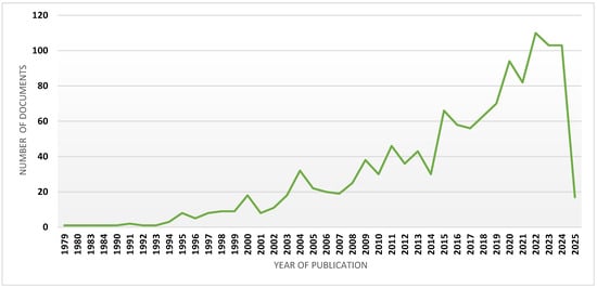To answer RQ1, the evolution of the number of scientific documents on technology in horticulture between 1979 and 2025 will be analyzed, identifying trends and publication patterns over this period. The evolution of research in applied horticultural technologies reflects a significant increase in scientific and technological interest over the last decades. Analyzing publication trends from 1990–2025, a gradual transformation of this field can be observed, with a marked acceleration of research activities in recent years (Figure 4).