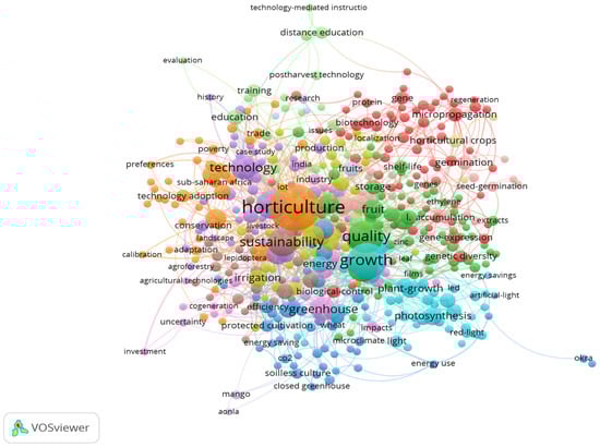 Finally, the light green cluster reflects the importance of education and training in agricultural technologies, highlighting terms such as “distance education”, “technology-mediated instruction”, and “training”. This suggests a growing recognition of the need for specialized training for the adoption and implementation of new technologies in horticulture, thus facilitating an effective transition to sustainable and innovative practices.