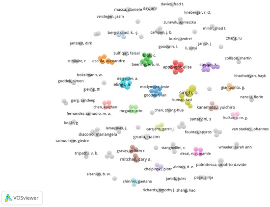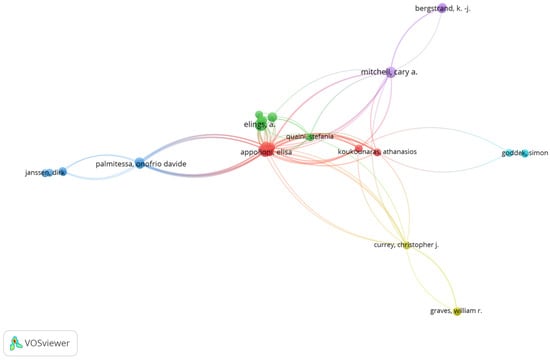 The authors’ co-citation network is structured into several thematic clusters. The red cluster, centered on Apolloni, Elisa and Koukounaras, Athanasios, indicates an active research area with multiple interdisciplinary connections. The green cluster, which includes Elings, A. and Quaini, Stefania, suggests a network centered on precision horticulture technologies. The blue cluster, with Palmintessa, Onofrio Davide in the center, seems oriented towards automation and digitized agriculture. The yellow cluster, centered around authors Currey, Christopher J. and Graves, William R., is associated with sustainable solutions applied to horticulture. In the purple cluster, Mitchell, Cary A. plays a key role, indicating a possible significant contribution in vertical farming and hydroponics.