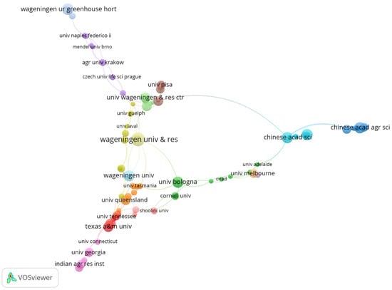 Furthermore, the red cluster encompasses prominent institutions from the United States, including “Texas A&M University”, the “University of Tennessee”, and the “University of Georgia”. This structure reflects an active research network dedicated to horticultural advancements in North America. Lastly, the green cluster connects European universities such as the “University of Bologna”, “Cornell University”, and “CIRAD”, forming a collaborative axis focused on agricultural technologies and sustainable horticultural practices.