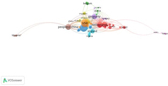 To answer RQ5, the countries contributing the most to research in digitized and sustainable horticulture will be analyzed, exploring the structure of international collaborations in this field. The analysis of the co-authorship network at the country level in the field of horticulture highlights a core group of nations with a high degree of scientific collaboration. The most influential countries within the network are the United States (USA), Germany, the Netherlands, and China, forming the primary hubs of international cooperation. These countries exhibit extensive research linkages, shaping the global landscape of horticultural studies.