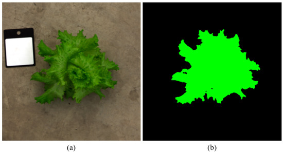 Lettuce origin image and target area mask: (a) lettuce image; (b) lettuce mask obtained through U2Net segmentation.