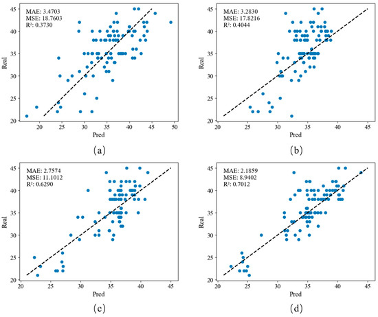 The ShuffleNet-v2-1.0 model obtained an R2 value of 0.9592, and the MSE and MAE were 132.9974 and 8.1430, respectively. The results are displayed in Figure 5.