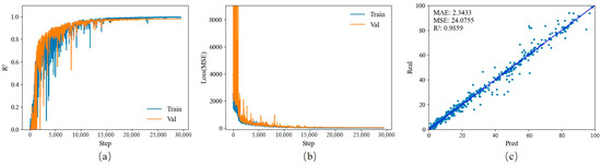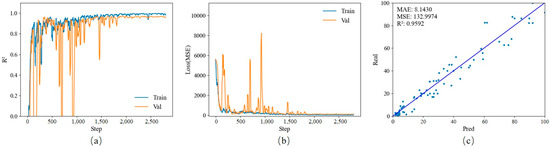 Training and testing results diagram of EfficientNet-v2-s model: (a) R2 rising curve during EfficientNet-v2-s model training; (b) MSE declining curve during EfficientNet-v2-s model training; (c) EfficientNet-v2-s model test result chart.