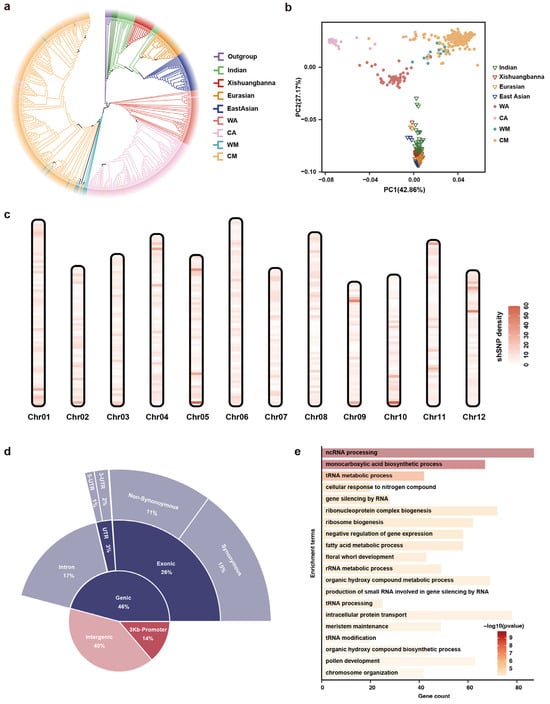Genetic differentiation between cucumber and melon and identification of trans-species polymorphisms. (a) Phylogenetic tree of cucumber and melon based on 168,829 SNPs at fourfold degenerate sites. (b) Principal component analysis (PCA) plot illustrating the genetic differentiation between cucumber and melon groups based on the first and second principal components. (c) The chromosome density plot of TSPs. (d) Genomic distribution of trans-species polymorphisms. (e) GO enrichment analysis of trans-species polymorphisms.