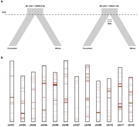 Demographic history and introgression of cucumber and melon. (a) Demographic parameter estimates for two models of species divergence. Arrows indicate gene flow, and TDIV represents divergence time. (b) Genomic introgression regions from cucumber into melon.