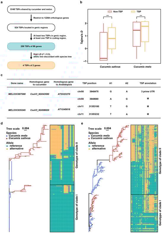 Identification of trans-species polymorphisms under long-term balancing selection. (a) SNP filtering pipeline to identify trans-species polymorphisms under long-term balancing selection. (b) Candidate TSPs exhibit higher Tajima’s D values compared to the genome-wide average. (c) Candidate genes and their TSP information. M indicate missense variant. *** indicates a statistically significant difference with a p value of less than 0.001. (d,e) Two candidate genes produce allelic trees rather than species trees, with each clade in the allelic trees displaying distinct genotypes. Light green bars represent the reference allele, while light orange bars represent the alternative allele. (d) Allelic tree of MELO3C007588. (e) Allelic tree of MELO3C035245.