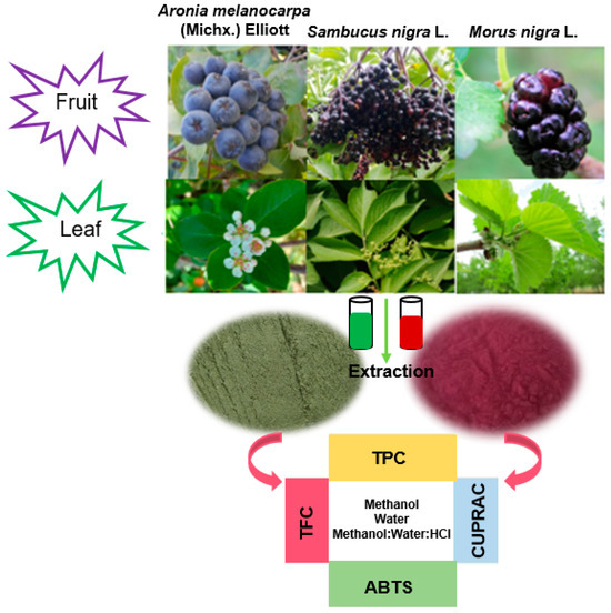 The method of extracting anthocyanins, proanthocyanidins, and other phenolic compounds from plant matrices is very important in elderberry (S. nigra L.), chokeberry (A. melanocarpa (Michx.) Elliot), and black mulberry (M. nigra L.). Equally important in this evaluation process is the initial step of extracting these bioactive compounds from plant matrices, as the extraction method and solvent choice significantly influence their recovery and preservation. Polar solvents, particularly methanol, are widely utilized in extracting hydrophilic phenolic acids, flavonoids, and anthocyanins, with methanol proving especially effective for extracting low-molecular-weight polyphenols [17,18]. Water as a solvent, either alone or in combination with organic solvents, has gained popularity due to its environmental friendliness [19]. Additionally, acidified solvents help stabilize anthocyanins and enhance their solubility, particularly in pigmented fruits such as chokeberry and black mulberry [20]. Despite the growing body of research on these species, the number of comparative studies examining multiple genotypes across different extraction methods remains limited. This gap in the literature necessitates a comprehensive investigation to better understand how different extraction solvents affect the bioactive compound profiles and their stability during digestion across various genotypes of these three fruit species. The aims of this study, in this regard, were to (I) evaluate the total phenolic content, total flavonoid content, and antioxidant capacity of fruit and leaf samples from multiple genotypes of S. nigra, A. melanocarpa, and M. nigra using three different extraction solvents and (II) determine the optimal extraction method for maximizing the recovery and preservation of health-promoting compounds from these fruits for potential applications in functional foods and nutraceuticals.