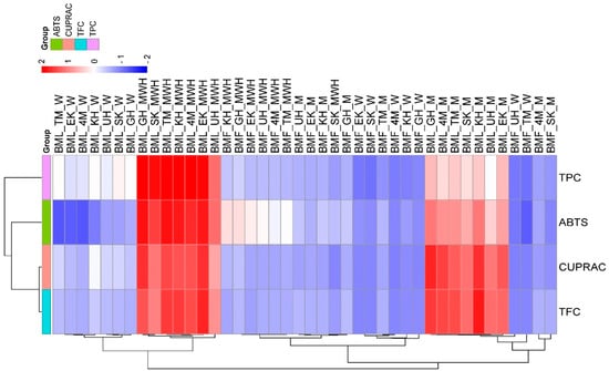 Hierarchical clustering heatmap of total phenolic content, total flavonoid content, and antioxidant capacities (ABTS, CUPRAC) in black mulberry (Morus nigra L.) fruit and leaf extracts under different solvent conditions. BML_TM_W: Black Mulberry Leaf Tohma Medik Water; BML_EK_W: Black Mulberry Leaf Erzincan Karadut Water; BML_4M_W: Black Mulberry Leaf 44 MRK 01 Water; BML_KH_W: Black Mulberry Leaf Karacaköy Horum Water; BML_UH_W: Black Mulberry Leaf Ürgüp Horum Water; BML_SK_W: Black Mulberry Leaf Şelale Karadut Water; BML_GH_W: Black Mulberry Leaf Gümüşhacıköy Horum Water; BML_GH_MWH: Black Mulberry Leaf Gümüşhacıköy Horum Methanol:Water:HCl; BML_SK_MWH: Black Mulberry Leaf Şelale Karadut Methanol:Water:HCl; BML_TM_MWH: Black Mulberry Leaf Tohma Methanol:Water:HCl; BML_KH_MWH: Black Mulberry Leaf Karacaköy Horum Methanol:Water:HCl; BML_4M_MWH: Black Mulberry Leaf 44 MRK 01 Methanol:Water:HCl; BML_EK_MWH: Black Mulberry Leaf Erzincan Karadut Methanol:Water:HCl; BML_UH_MWH: Black Mulberry Leaf Ürgüp Horum Methanol:Water:HCl; BMF_KH_MWH: Black Mulberry Fruit Karacaköy Horum Methanol:Water:HCl; BMF_GH_MWH: Black Mulberry Fruit Gümüşhacıköy Horum Methanol:Water:HCl; BMF_EK_MWH: Black Mulberry Fruit Erzincan Karadut Methanol:Water:HCl; BMF_UH_MWH: Black Mulberry Fruit Ürgüp Horum Methanol:Water:HCl; BMF_4M_MWH: Black Mulberry Fruit 44 MRK 01 Methanol:Water:HCl; BMF_TM_MWH: Black Mulberry Fruit Tohma Methanol:Water:HCl; BMF_UH_M: Black Mulberry Fruit Ürgüp Horum Methanol; BMF_EK_M: Black Mulberry Fruit Erzincan Karadut Methanol; BMF_KH_M: Black Mulberry Fruit Karacaköy Horum Methanol; BMF_SK_MWH: Black Mulberry Fruit Şelale Karadut Methanol:Water:HCl; BMF_GH_M: Black Mulberry Fruit Gümüşhacıköy Horum Methanol; BMF_EK_W: Black Mulberry Fruit Erzincan Karadut Water; BMF_SK_W: Black Mulberry Fruit Şelale Karadut Water; BMF_TM_M: Black Mulberry Fruit Tohma Methanol; BMF_4M_W: Black Mulberry Fruit 44 MRK 01 Water; BMF_KH_W: Black Mulberry Fruit Karacaköy Horum Water; BMF_GH_W: Black Mulberry Fruit Gümüşhacıköy Horum Water; BML_GH_M: Black Mulberry Leaf Gümüşhacıköy Horum Methanol; BML_4M_M: Black Mulberry Leaf 44 MRK 01 Methanol; BML_TM_M: Black Mulberry Leaf Tohma Methanol; BML_SK_M: Black Mulberry Leaf Şelale Karadut Methanol; BML_KH_M: Black Mulberry Leaf Karacaköy Horum Methanol; BML_UH_M: Black Mulberry Leaf Ürgüp Horum Methanol; BML_EK_M: Black Mulberry Leaf Erzincan Karadut Methanol; BMF_UH_W: Black Mulberry Fruit Ürgüp Horum Water; BMF_TM_W: Black Mulberry Fruit Tohma Water; BMF_4M_M: Black Mulberry Fruit 44 MRK 01 Methanol; BMF_SK_M: Black Mulberry Fruit Şelale Karadut Methanol.