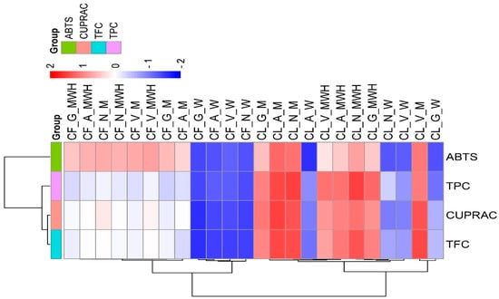 Hierarchical clustering heatmap of total phenolic content, total flavonoid content, and antioxidant capacities (ABTS and CUPRAC) in chokeberry (Aronia melanocarpa) fruit and leaf extracts under different solvent conditions. CF_G_MWH: Chokeberry Fruit Galicjanka Methanol:Water:HCl; CF_A_MWH: Chokeberry Fruit Aron Methanol:Water:HCl; CF_N_M: Chokeberry Fruit Nero Methanol; CF_N_MWH: Chokeberry Fruit Nero Methanol:Water:HCl; CF_V_M: Chokeberry Fruit Viking Methanol; CF_V_MWH: Chokeberry Fruit Viking Methanol:Water:HCl; CF_G_M: Chokeberry Fruit Galicjanka Methanol; CF_A_M: Chokeberry Fruit Aron Methanol; CF_G_W: Chokeberry Fruit Galicjanka Water; CF_A_W: Chokeberry Fruit Aron Water; CF_V_W: Chokeberry Fruit Viking Water; CF_N_W: Chokeberry Fruit Nero Water; CL_G_M: Chokeberry Leaf Galicjanka Methanol; CL_A_M: Chokeberry Leaf Aron Methanol; CL_N_M: Chokeberry Leaf Nero Methanol; CL_A_W: Chokeberry Leaf Aron Water; CL_V_MWH: Chokeberry Leaf Viking Methanol:Water:HCl; CL_A_MWH: Chokeberry Leaf Aron Methanol:Water:HCl; CL_N_MWH: Chokeberry Leaf Nero Methanol:Water:HCl; CL_G_MWH: Chokeberry Leaf Galicjanka Methanol:Water:HCl; CL_N_W: Chokeberry Leaf Nero Water; CL_V_W: Chokeberry Leaf Viking Water; CL_V_M: Chokeberry Leaf Viking Methanol; CL_G_W: Chokeberry Leaf Galicjanka Water.