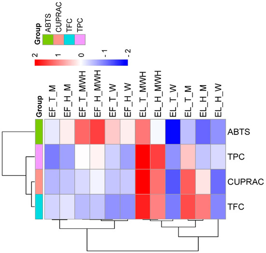 Hierarchical clustering heatmap of total phenolic content, total flavonoid content, and antioxidant capacities (ABTS and CUPRAC) in elderberry (Sambucus nigra L.) fruit and leaf extracts under different solvent conditions. EF_T_M: Elderberry Fruit Tokat(T1) Methanol; EF_H_M: Elderberry Fruit Haschberg Methanol; EF_T_MWH: Elderberry Fruit Tokat(T1) Methanol:Water:HCl; EF_H_MWH: Elderberry Fruit Haschberg Methanol:Water:HCl; EF_T_W: Elderberry Fruit Tokat(T1) Water; EF_H_W: Elderberry Fruit Haschberg Water; EL_T_MWH: Elderberry Leaf Tokat(T1) Methanol:Water:HCl; EL_H_MWH: Elderberry Leaf Haschberg Methanol:Water:HCl; EL_T_W: Elderberry Leaf Tokat(T1) Water; EL_T_M: Elderberry Leaf Tokat(T1) Methanol; EL_H_M: Elderberry Leaf Haschberg Methanol; EL_H_W: Elderberry Leaf Haschberg Water.