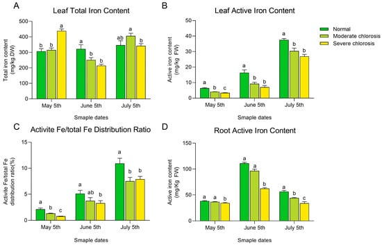 Iron content in roots and leaves of pear trees under different iron deficiency conditions. (A) Total iron content in leaves. (B) Active iron content in leaves. (C) Active iron content in leaves as a percentage of total iron. (D) Active iron content in roots. Different letters indicate significant differences at the p < 0.05 level.