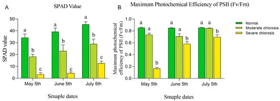 SPAD values, which serve as a relative indicator of chlorophyll content, were used to assess leaf chlorosis [24]. The results (see Figure 3A) indicated that SPAD values decreased significantly with the aggravation of chlorosis. The SPAD values of the normal group were 1.87 and 10.26 times, 1.70 and 8.88 times, and 1.57 and 3.59 times those of the moderate and severe chlorosis groups in each respective month. The maximum photochemical efficiency (Fv/Fm), reflecting the light energy conversion efficiency of PSII reaction centers, showed minor variations under normal conditions but decreased significantly under iron stress [25]. Results demonstrated that Fv/Fm values remained relatively stable in the normal group, with no significant differences observed between moderately chlorotic and normal leaves across months. However, Fv/Fm values in severely chlorotic leaves were significantly lower than those in both normal and moderately chlorotic groups. The Fv/Fm values of severely chlorotic leaves dropped to 0.16 in May and remained around 0.6 from June to July. These findings indicate that both moderate and severe iron deficiency chlorosis can reduce relative chlorophyll content, but only severe chlorosis significantly inhibits photosynthesis. The concurrent decline in SPAD values and Fv/Fm ratio under severe iron deficiency may be attributed to impaired iron mobility within plants, particularly given that our sampling focused on the 3rd to 5th newly emerged leaves at shoot apices—positions subject to lower iron allocation priority [26]. In contrast, the observed recovery of Fv/Fm values in June and July likely correlates with the dynamic accumulation of active iron content in leaves during developmental progression (Figure 3B).