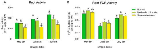 The results indicated that during the experimental period, there was no significant difference in root vitality between the normal and moderate groups, but both were significantly higher than the severe chlorosis group. Pear trees need to reduce Fe3+ to Fe2+ in their roots for effective absorption, so the activity of root FCR can reflect the plant’s iron absorption ability [28]. As shown in Figure 4B, from May to July, the activity of root FCR in all groups exhibited a trend of first decreasing and then increasing.