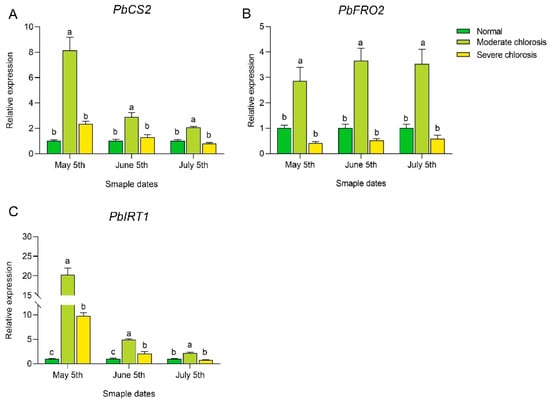 To further investigate the impact of different chlorosis levels on the expression of genes involved in iron uptake and transport, we examined the expression levels of PbCS2 (Pyrus bretschneideri Citrate Synthase 2), PbFRO2 (Pyrus bretschneideri Ferric Reductase Oxidase 2), and PbIRT1 (Pyrus bretschneideri Iron-Regulated Transporter 1) in the roots of ‘Yali’ pears (see Figure 6). In this study, root expression of PbCS2 gradually decreased from May to July, while its expression in the moderate chlorosis group was significantly higher than in both the normal and severe chlorosis groups, with fold changes of 8.09 and 3.46, 2.88 and 2.25, and 2.05 and 2.50, respectively. As shown in Figure 6B, from May to July, root PbFRO2 expression in the moderate chlorosis group was significantly higher than in both the normal and severe groups, with fold differences of 2.86 and 7.09, 3.62 and 6.99, and 3.49 and 5.97, respectively; the normal group exhibited slightly higher PbFRO2 expression than the severe group, though the difference was not significant. This indicates that moderate chlorosis may be the critical threshold for inducing high PbFRO2 expression, which helps enhance iron uptake in the roots. As shown in Figure 6C, in May and June, the expression of PbIRT1 in the moderate and severe chlorosis groups was significantly higher than in the normal group, with fold differences of 20.25 and 9.75, and 4.88 and 2.07, respectively, and the moderate group was significantly higher than the severe group; in July, the expression in the moderate group was significantly higher than in both the normal and severe groups. Our findings revealed a significant negative correlation between iron deficiency status and root iron translocation capacity in pear trees, with enhanced root iron transport activity under moderate deficiency but markedly reduced capacity observed during severe leaf chlorosis.