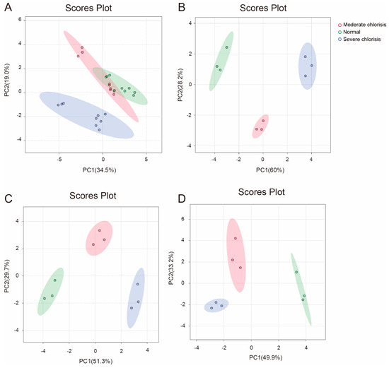 PCA of ‘Yali’ pears at different sampling times under different degrees of iron deficiency. (A) All samples grouped by chlorosis severity, regardless of sampling time. (B) Data from May. (C) Data from June. (D) Data from July.