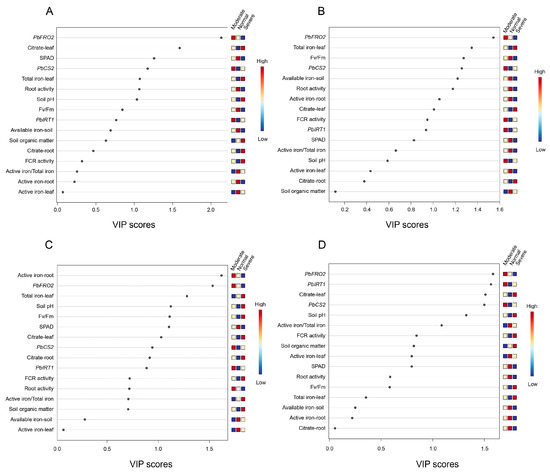Further comparison of the PCA loadings and VIP values revealed some degree of difference in variable selection. This is primarily because PCA identifies the directions of maximum variance in the dataset, while PLS-DA VIP analysis selects the most discriminative variables for classification. Therefore, in PCA, parameters such as SPAD, citrate content, and soil active iron content may exhibit higher loadings, whereas in VIP analysis, PbFRO2 contributes more to classification. This suggests that PCA primarily captures the overall physiological changes under iron deficiency, while VIP analysis highlights the molecular regulators that are crucial for adaptation. Overall, PbFRO2 plays a key role at all time points, and different compensatory mechanisms may be involved in maintaining iron homeostasis during specific growth stages.
