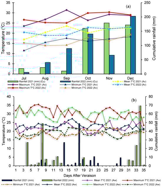 For both production cycles, pruning was carried out in July, while harvest occurred in December. Throughout the study, meteorological variables were monitored, including air temperature (mean, minimum, and maximum) and rainfall, with monthly records during the production cycle. During the berry ripening period, climate measurements were intensified, with daily records for both production cycles (Figure 1a,b).