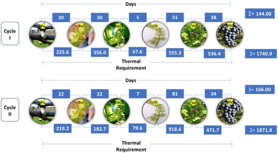 Characterizing grapevine phenological development allows for the refinement of management practices, optimizing input use and scheduling agricultural activities. Furthermore, understanding the cultivar’s thermal requirements enables the prediction of its production cycle duration under different climatic conditions, facilitating decision making to maximize productivity and fruit quality [41,42].