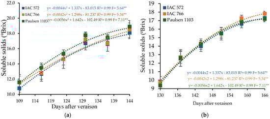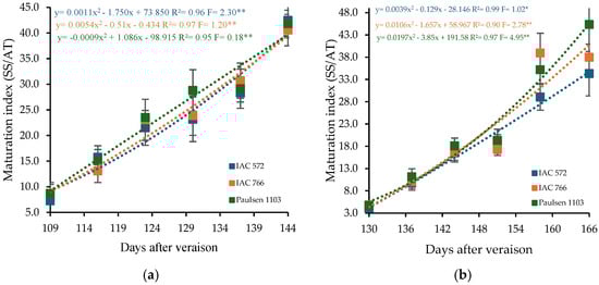 Soluble solids content (SS) in the must of ‘BRS Núbia’ grapes cultivated during production cycle I (a) and cycle II (b), São Manuel-SP, 2023. Significant F-value at p < 0.05 (n = 6). The rootstocks ‘IAC 572’, ‘IAC 766’, and ‘Paulsen 1103’ are represented by blue, orange, and green colors, respectively. ** p > 0.05.