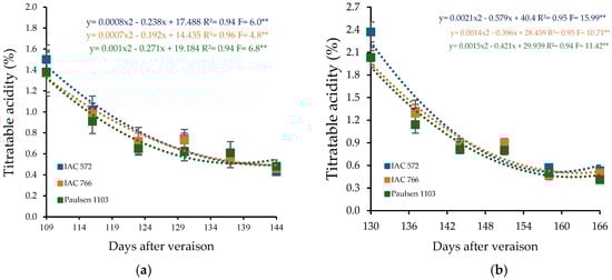 Titratable acidity (TA) in the must of ‘BRS Núbia’ grapes cultivated during production cycle I (a) and cycle II (b), São Manuel-SP, 2023. Significant F-value at p < 0.05 (n = 6). The rootstocks ‘IAC 572’, ‘IAC 766’, and ‘Paulsen 1103’ are represented by blue, orange, and green colors, respectively. ** p > 0.05.