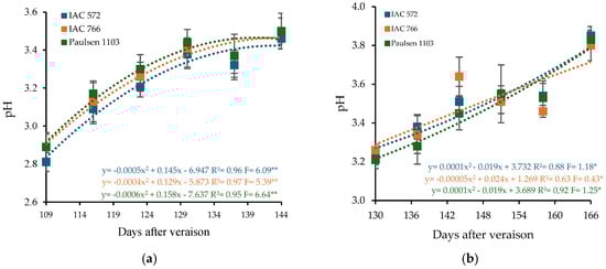 The pH of ‘BRS Núbia’ grape must varied according to the rootstock and production cycle. In the first cycle, the must pH values were 3.21, 3.26, and 3.28 for the rootstocks ‘IAC 572 Jales’, ‘IAC 766 Campinas’, and ‘Paulsen 1103’, respectively. In the second cycle, these values increased to 3.51, 3.50, and 3.48 (Figure 5), aligning with results obtained for grapevines cultivated in the Cerrado [69]. Quadratic regression models revealed that maximum pH values were reached at 144, 144, and 132 DAP in cycle I and at 158, 166, and 143 DAP in cycle II, depending on the rootstock used (Figure 5).