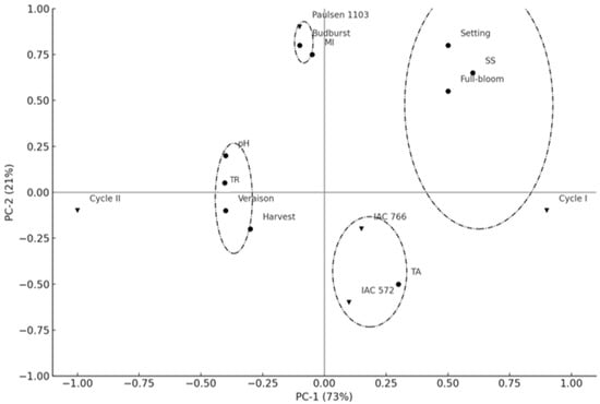 Principal Component Analysis (PCA) enabled the visualization of variability among rootstocks (‘IAC 572 Jales’, ‘IAC 766 Campinas’, and ‘Paulsen 1103’) and production cycles (cycle I and cycle II) of the ‘BRS Núbia’ cultivar. The first two principal components together explained 94% of the total data variability (PC-1 = 73%; PC-2 = 21%), indicating a robust representation of the interrelationships among the analyzed factors (Figure 7).