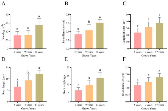 The morphological indicators of understory ginseng at different growth years. (A) Ginseng yield. (B) The diameter of ginseng stems. (C) The length of ginseng stems. (D) The length of ginseng roots. (E) The fresh weight of ginseng roots. (F) The diameter of ginseng stems.
