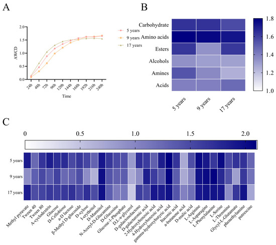 In order to understand the microbial metabolic reactions, the Biolog EcoPlate analysis was carried out. This method can characterize the metabolic fingerprints of microbial communities based on their ability to utilize different carbon sources [30]. The average well color development (AWCD) indicates the overall microbial activity in utilizing carbon sources (Figure 3A). In the early stages of cultivation, the 17-year group had the highest growth rate and reached a relatively stable trend at 120 h, while the 9-year group had the lowest growth rate and reached a relatively stable trend at 168 h.