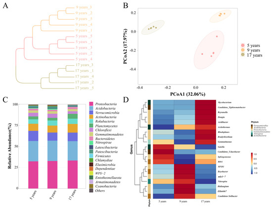 In all samples, there were nine bacterial communities with relative abundance greater than 1% at the phylum level, which were Proteobacteria, Acidobacteria, Verrucomicrobia, Actinobacteria, Rokubacteria, Planctomycetes, Chloroflexi, Gemmatimonadetes, and Bacteroidetes (Figure 4C). It can be seen that the two phyla with higher relative abundance in all three age groups showed little difference, while the main differences were concentrated in the phyla with lower abundance. For example, Verrucomicrobia was significantly higher in the 5-year group compared to the other two groups, while Planctomycetes was significantly higher in the 17-year group, and Chloroflexi was significantly lower in the 17-year group compared to the other two.