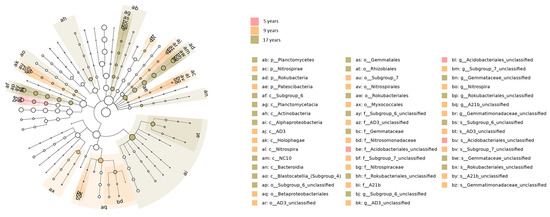 Linear discriminant analysis (LDA value > 3.5, Figure 5) showed the composition of bacterial communities across the three samples. The sample from the 5-year group had the fewest differential bacterial species, with only three types, while the 9-year and 17-year samples had more, with 13 and 14 species, respectively. This suggests that, compared to the two groups with longer growth durations, the group with a shorter growth duration had fewer differential bacterial species.