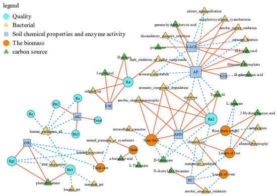 The correlation network diagram between the biomass and ginsenoside content of understory ginseng and soil chemical properties, enzyme activity, bacterial abundance, and carbon sources. In the figure, solid red lines represent positive correlations, while dashed blue lines represent negative correlations.