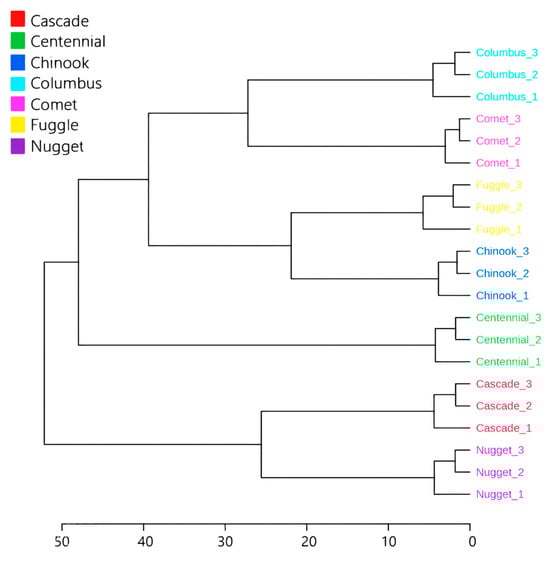Hierarchical Cluster Analysis (HCA) of Humulus lupulus L. essential oil from different varieties grown in Brazil.
