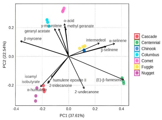 The first group consists of the Cascade and Nugget variety, which differed most among the samples. This variation could be attributed to their similar levels of α-humulene, which are notably higher than those observed in the other varieties. The second group includes just the Centennial variety, displaying a markedly different profile, with only 7.98% β-myrcene but a substantial 31.09% of (E)-β-farnesene, making it the predominant compound in this variety. This hop is commonly used for dual purposes, both aroma and bittering, though farnesene is listed as one of its minor constituents on commercial pellet packaging. The third group consists of Chinook and Fuggle, the fourth group is formed by Comet variety, and the fifth is formed by Columbus. These results can be explained by PCA, where the weights of each variable for the formed groups are shown in Figure 2. The first two principal components explained 60.15% of the total variance, with PC1 accounting for 37.61% and PC2 for 22.54%.