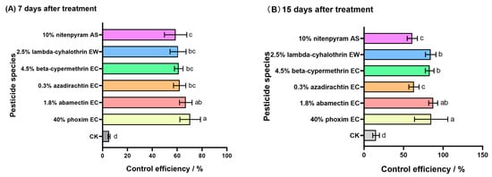 | 40% phoxim EC | 90.98 ± 1.64 a | 90.37 ± 1.75 a | 100 ± 0.00 a | 100 ± 0.00 a | 100 ± 0.00 a | 100 ± 0.00 a | 100 ± 0.00 a | 100 ± 0.00 a |